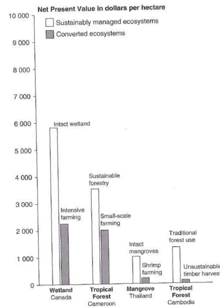 when looking at statistics comparing the net present value in dollars per hectare between sustainably managed ecosystems and converted ecosystems, you can see that ecosystems that are sustainably managed are far more profitable than those that have been converted. the difference is averaging an over half profitability.