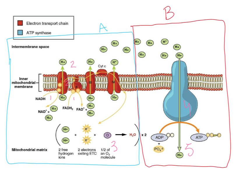 electrons move through protein complexes, pumping H+ into intermembrane space
