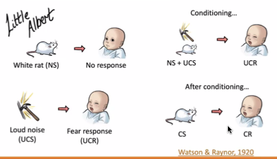 Little Albert: Was taught to fear white rabbits via classical conditioning. Was shown prior to have no fears of any animals. A steel bar was struck by a hammer whenever he reached for a white rat, and after 6 times he was thought it fear them. He demonstrated this, and then it was demonstrated that he had generalized this fear, to white animals in general. White rat starts as a neutral stimulus (NS), the loud noise is the unconditioned stimulus (US)