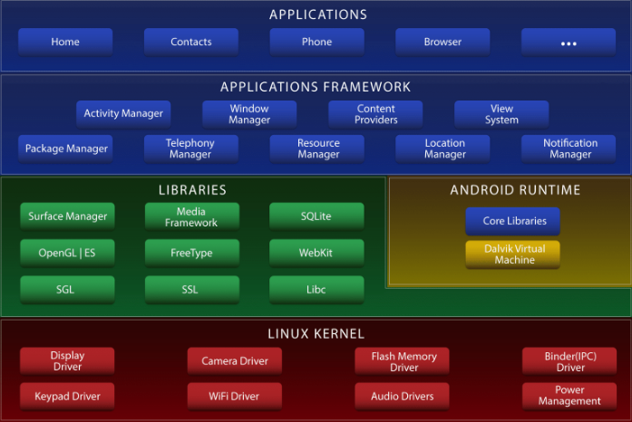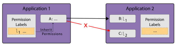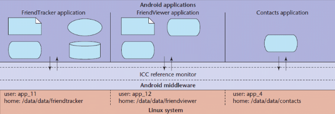 Each application has its own unique UID and communicates with data or resources on the system through a Reference Monitor and through Android middleware that eventually translates down into a Linux kernel