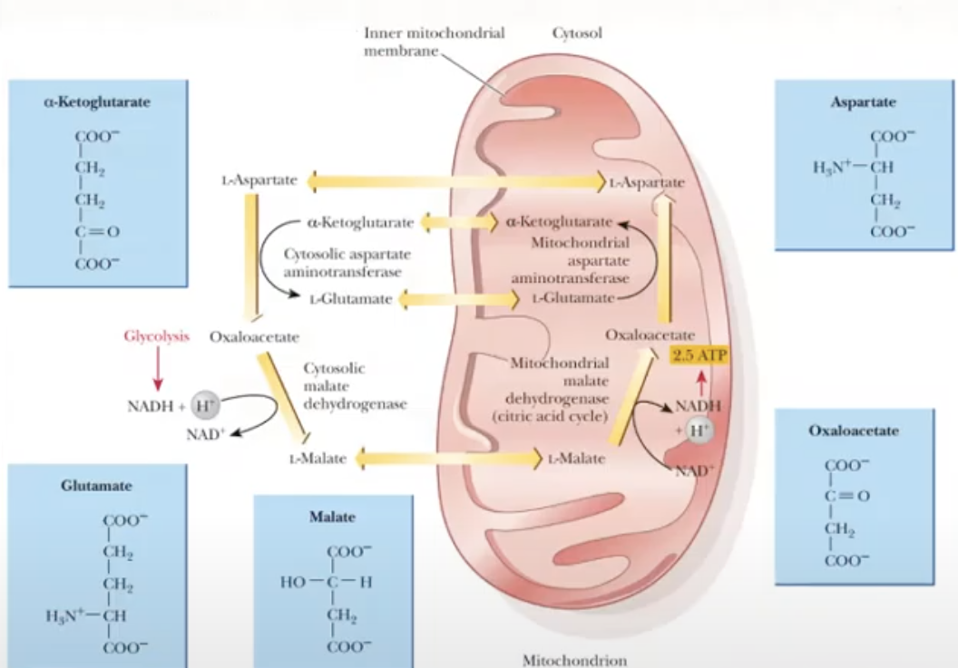 a mechanism for transferring e- from NADH in the cytosol to FADH2 in the mitochondria
