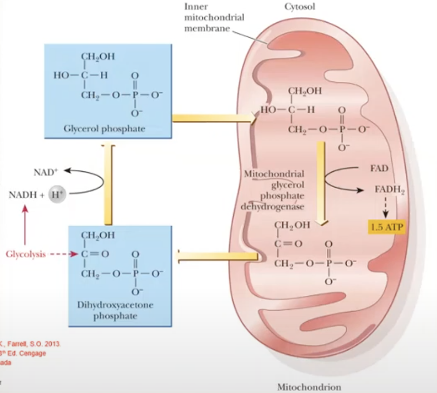 NADH (from glycolysis in cytosol) cant cross the mitochondrial membrane but dihydroxyacetone phosphate and glycerol phosphate can