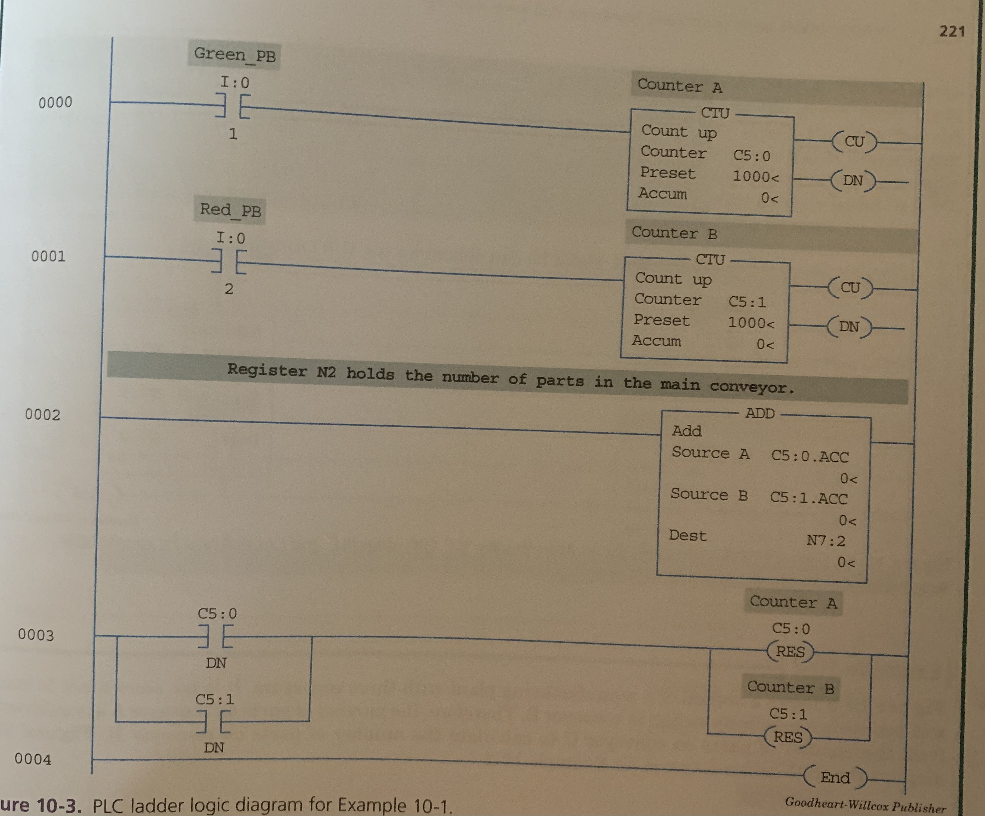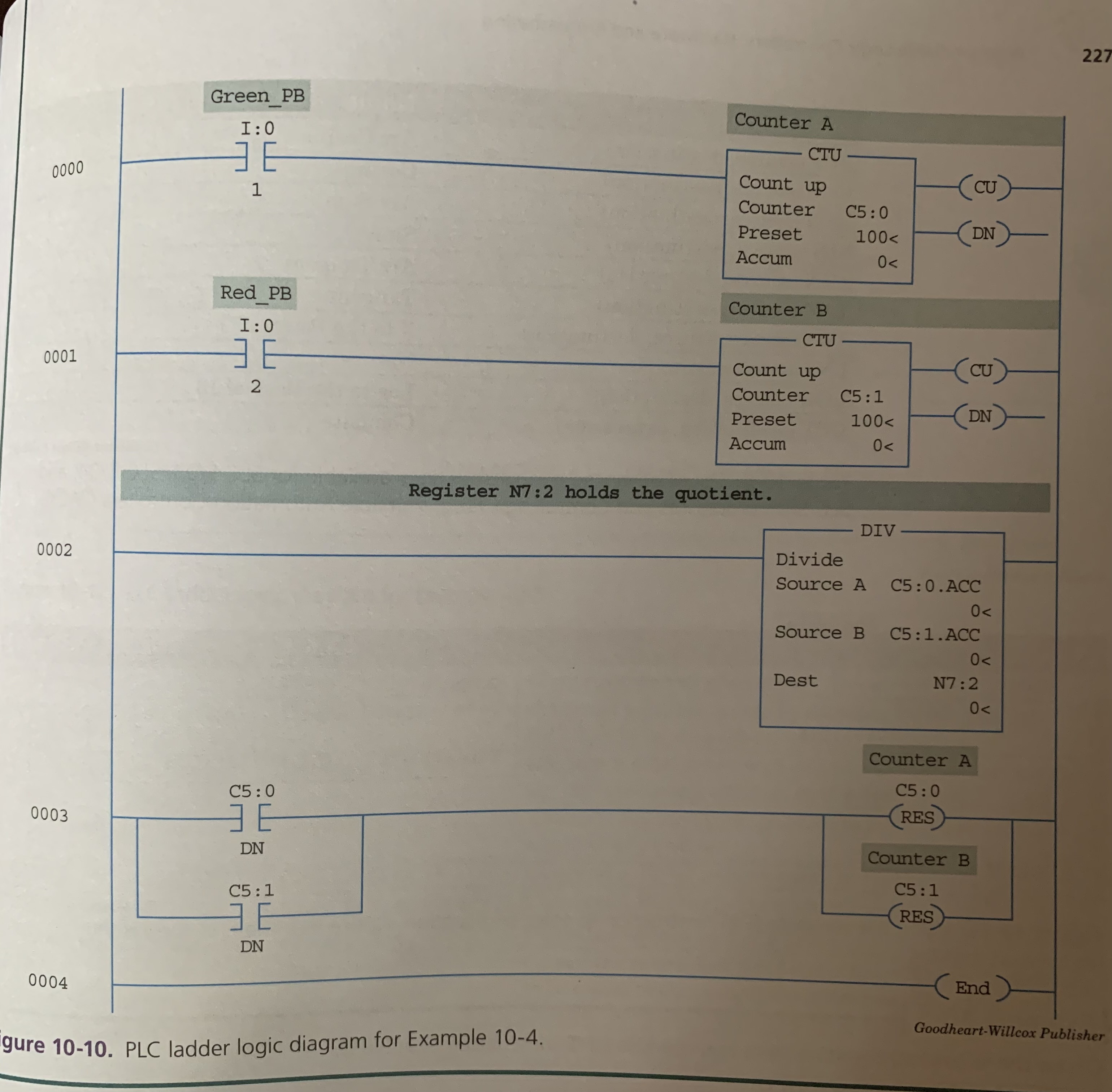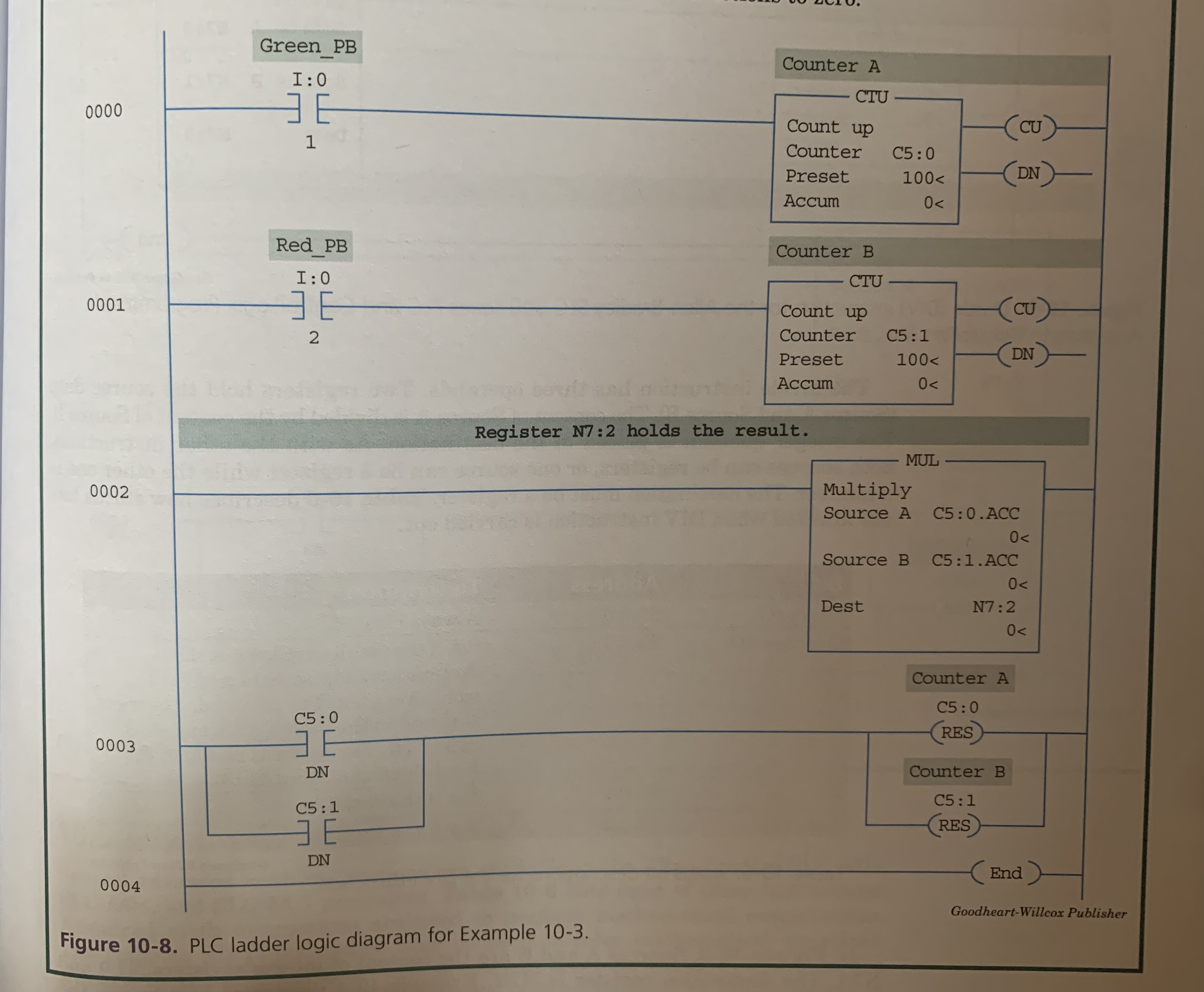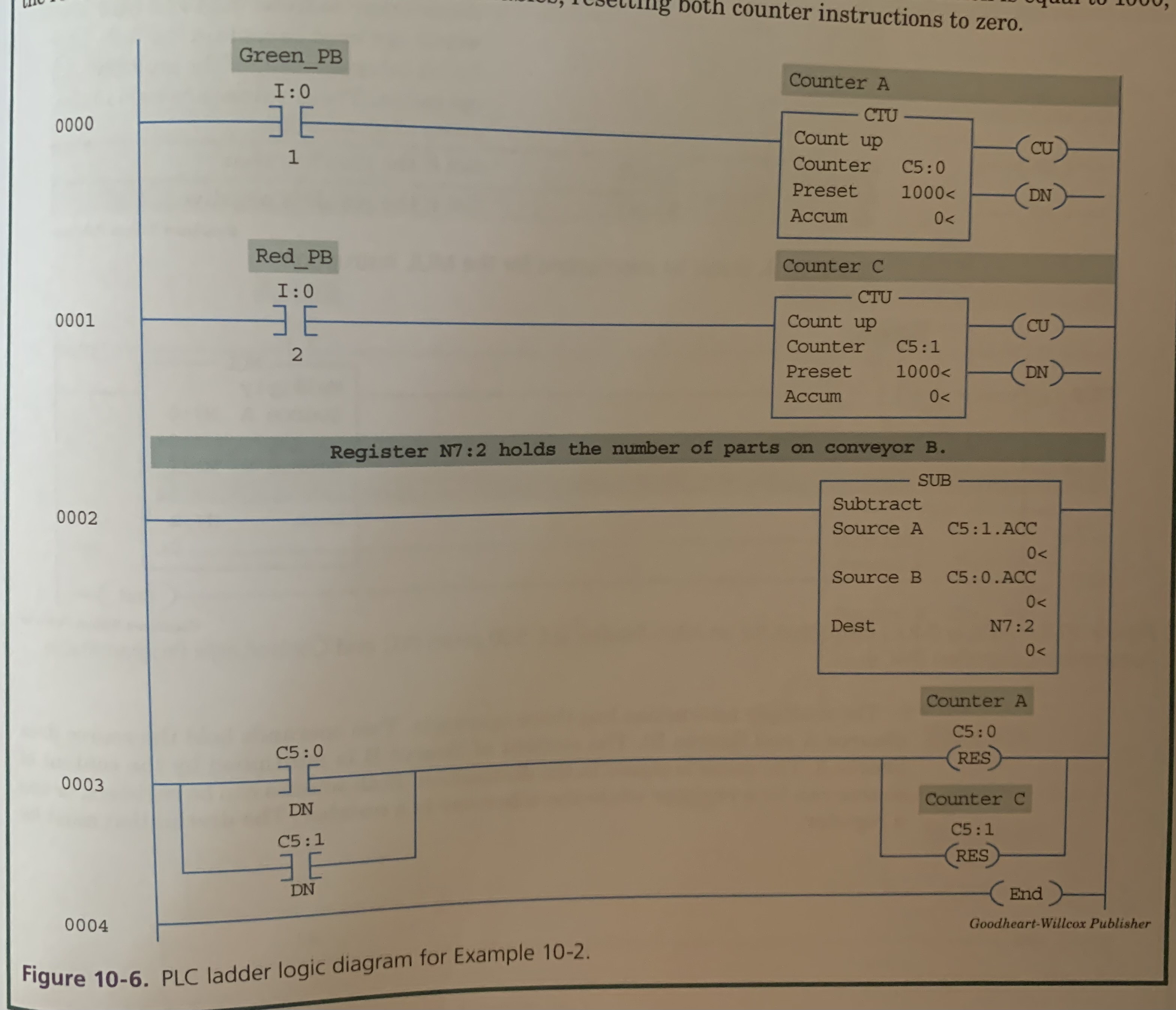 Uses add, subtract, multiply, and divide to calculate the sum, difference, product, and quotient of the content of registers in two PLC counter instructions.