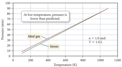 But at lower temperatures, the pressure of gases is less than that of an ideal gas.