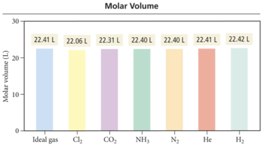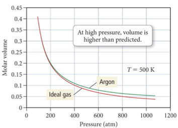 Because real molecules take up space, the molar volume of a real gas is larger than predicted by the ideal gas law at high pressures.