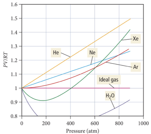So on a graph of PV/RT vs. P, an ideal gas would be a flat line at 1.