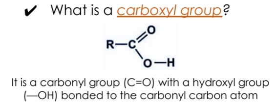 Carboxyl Group Structure: A carbonyl group (C=O) with a hydroxyl group (—OH) attached to the carbonyl carbon.