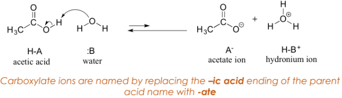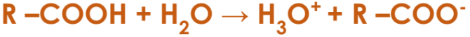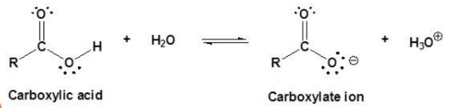 Reaction in water produces hydrogen ions, resulting in hydronium and carboxylate ions.