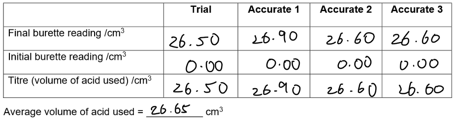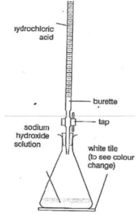 titration – an experiment to determine the volumes of solutions (usually acid and alkali) that react together to produce a pure solution