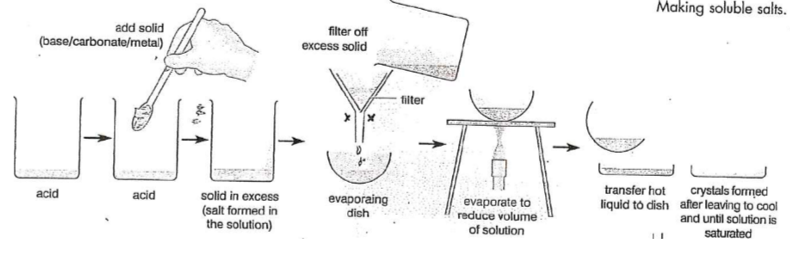 Excess solid method – Add excess insoluble solid (metal or base) to an acid, then filter off unreacted solid. Forms soluble salts (not Group I or ammonium salts).