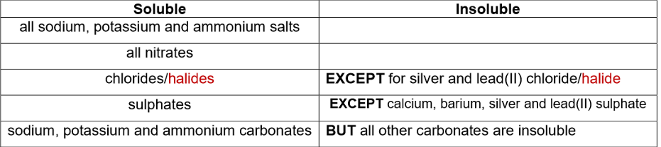 Insoluble salts are made by precipitation, mixing two soluble salts to form an insoluble solid (precipitate) and a soluble salt. Partners ‘swap’ in the reaction.
