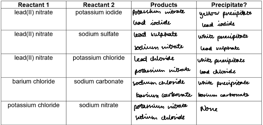 Repeat for all combinations and fill in the results table with ionic equations for any precipitate.
