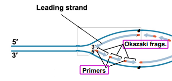 Lagging strand: One portion of DNA is it is being replicated by DNA Pol in the 3’ to 5’ direction, results in Okazaki fragments made discontinuously. Each fragment requires a separate RNA primer
