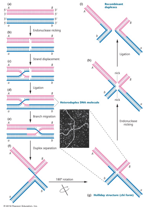 Holliday Model: Model of recombination, simple and doesn’t involve DNA synthesis. Has two homologs, internal strand endings are displaced and paired with complements on opposite duplexes. Ligase seals the loose ends, making a hybrid duplex