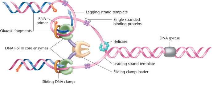 DNA gyrase (topoisomerase): Relieves strain ahead of the replication fork before helicase can split it into ssDNA, one of many DNA topoisomerases