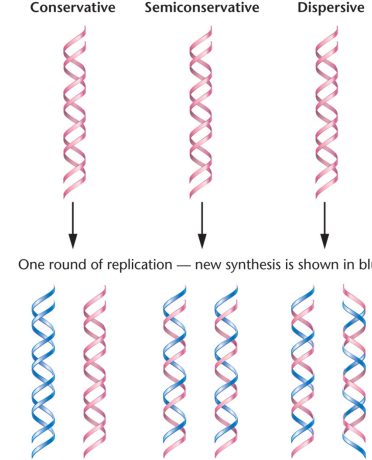 Semiconservative replication: Correct model of replication, describes how one old strand and one new strand are a part of new DNA