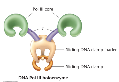 Holoenzyme: Active form of DNA Polymerase III, made up of complex subunits. Alpha for 5’ → 3’ polymerization, epsilon for 3’ to 5’ exonuclease, and theta for core assembly. The y complex loads the enzyme on template and acts as the clamp loader. Beta is the sliding clamp structure, and tau dimerizes core complexes