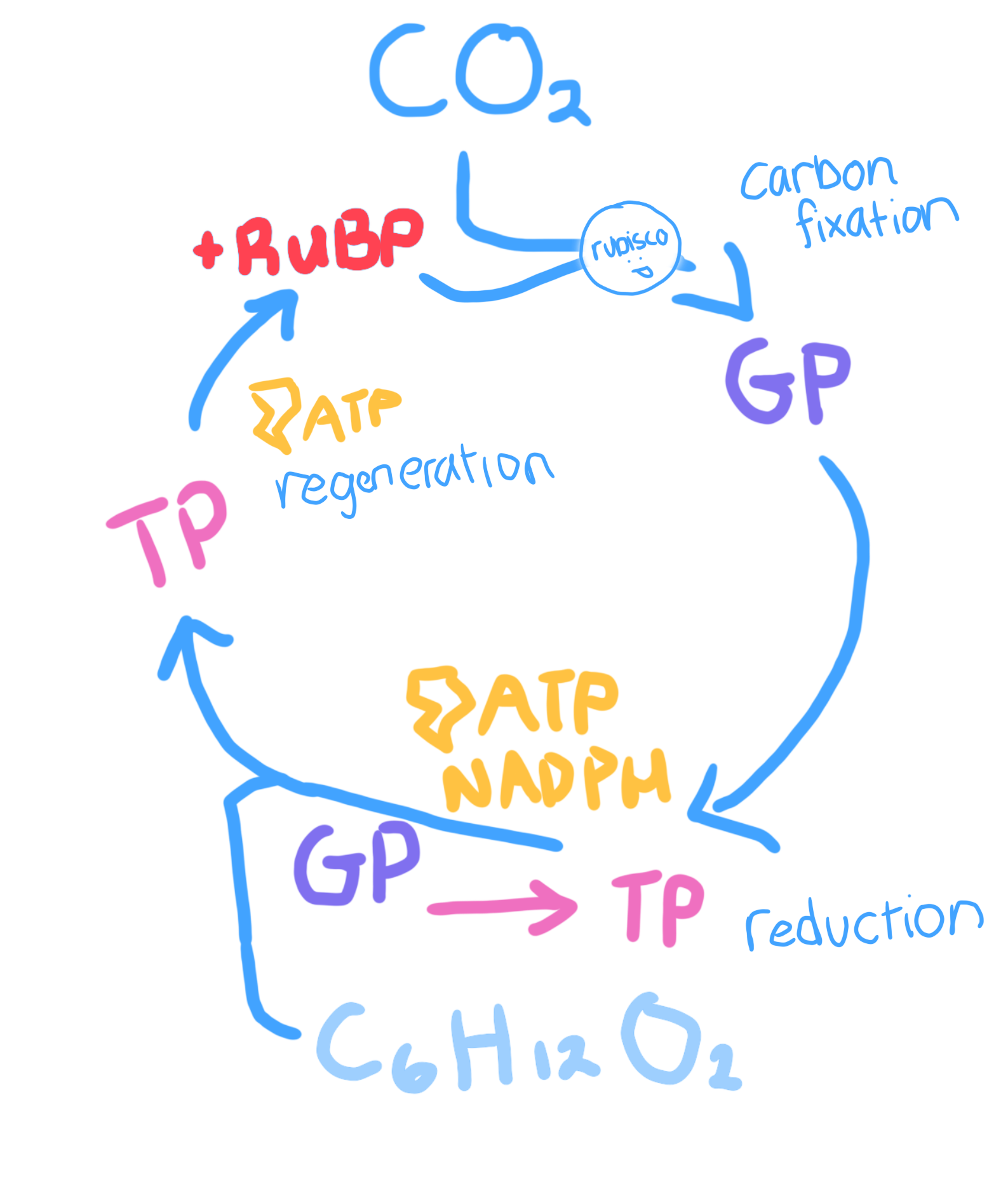 The Calvin Cycle (Light Independent Reaction) occurs in the stroma. The first step of Carbon Fixation occurs through the enzyme Rubisco as reactants CO2 and RuBP form the product GP.