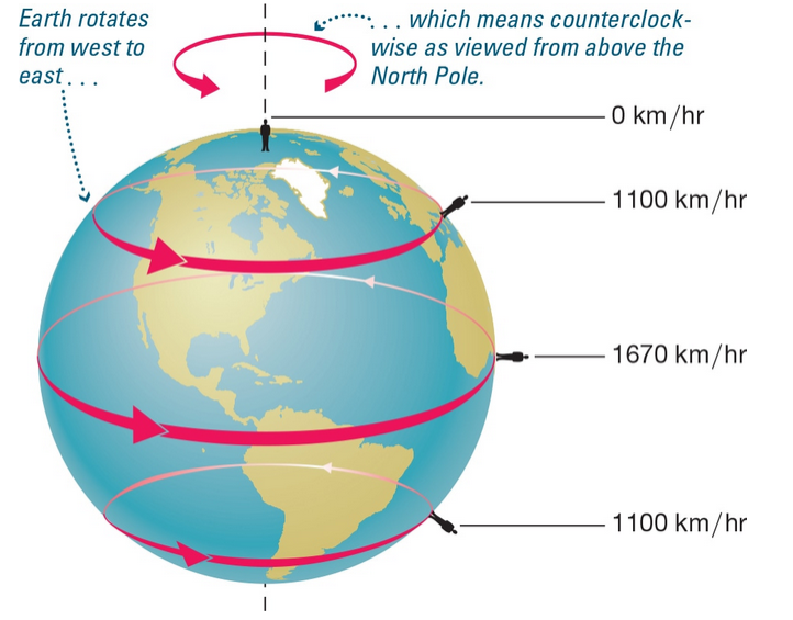 ☉ Earth rotates from west to east- which means counterclockwise as viewed from above the North Pole.