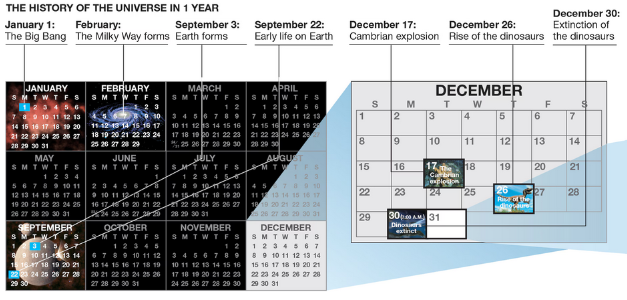 The cosmic calendar compresses the 14-billion-year history of the universe into 1 year, so that each month represents a little more than 1.2 billion years.