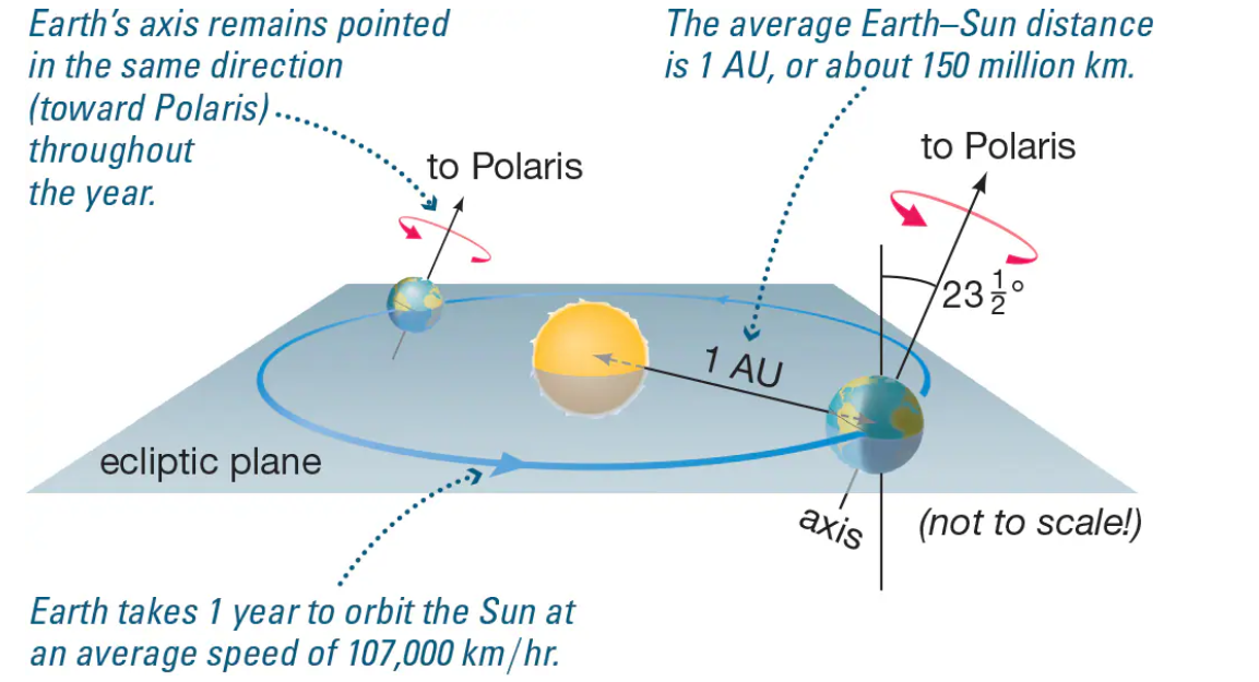 ☉ Earth rotates once each day and orbits the Sun once each year. Its average orbital distance, called an astronomical unit (AU), is about 150 million kilometers.