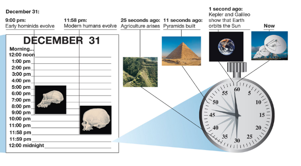 ☉ Early humans arose just a few million years ago, which therefore means just a few hours before the present moment (the stroke of midnight)