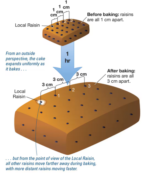 An expanding raisin cake offers an analogy to the expanding universe. Someone living in one of the raisins inside the cake could figure out that the cake is expanding by noticing that all other raisins are moving away, with more distant raisins moving away faster. In the same way, we know that we live in an expanding universe because all galaxies outside our Local Group are moving away from us, with more distant ones moving faster.