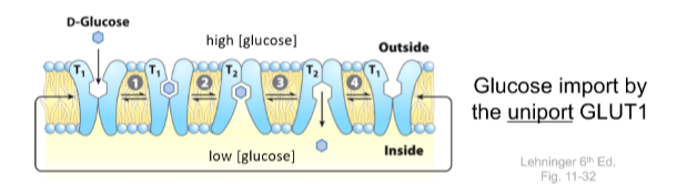 GLUT1 = Uniporter, only glucose and based on the concentration gradient, not in any one direction