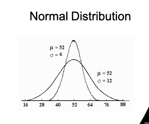 Two reference axis marks observed around μ = 52 in the example plots, illustrating how increasing σ widens the curve.