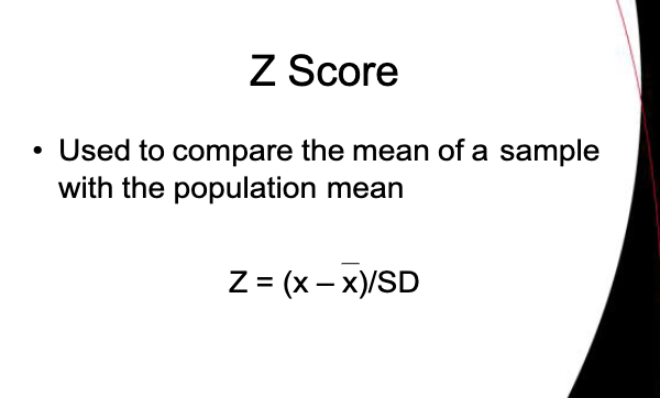 Z = (x – μ) / σ (used to compare a single score to the population distribution)