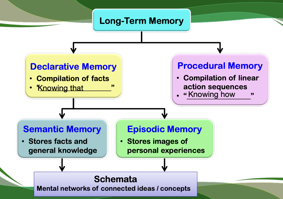 Concept: Information is stored in long-term memory in schema (networks of connected facts and concepts) that provide a structure for making sense of new information