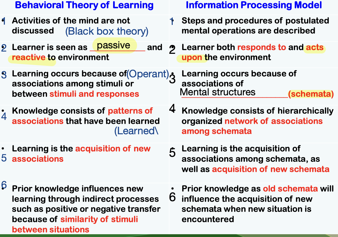The information-processing model emphasizes cognitive operations unlike the behavioral model, which treats the mind as a black box focusing only on observable behavior.
