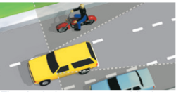 Blind spots = areas around the vehicle where a driver cannot see when looking straight ahead or using the mirrors. (the sides, slightly behind the driver)
