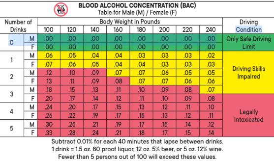 Blood alcohol concentration (BAC) limits = BAC measures how much alcohol is present in your bloodstream.