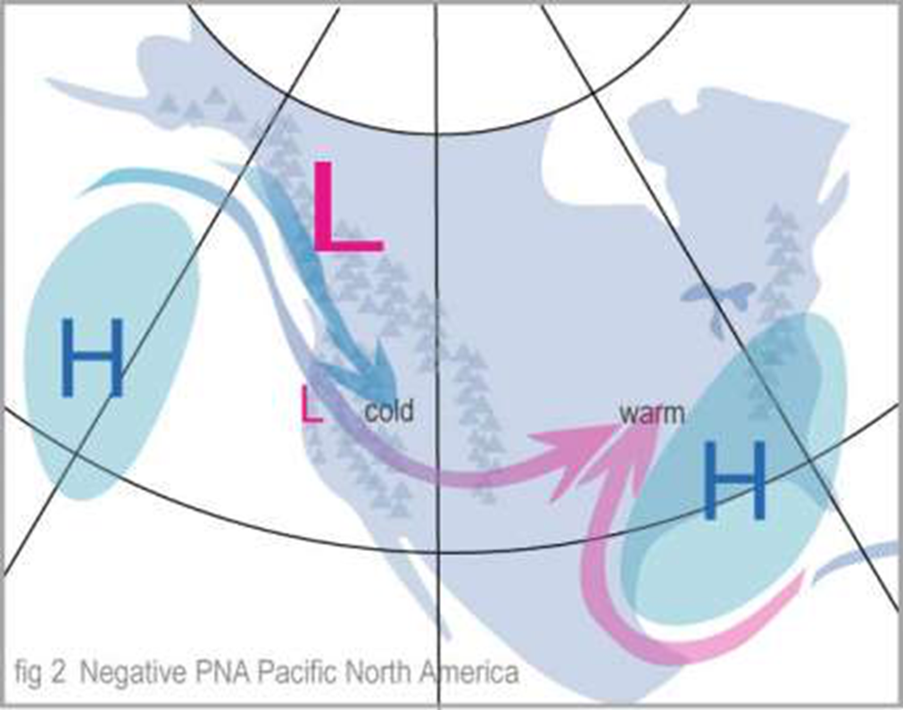 Negative: warm SST anomalies interior North Pacific. Cool SST anomalies along NA coast. Above avg sea level pressure over North Pacific. Currently in neg phase