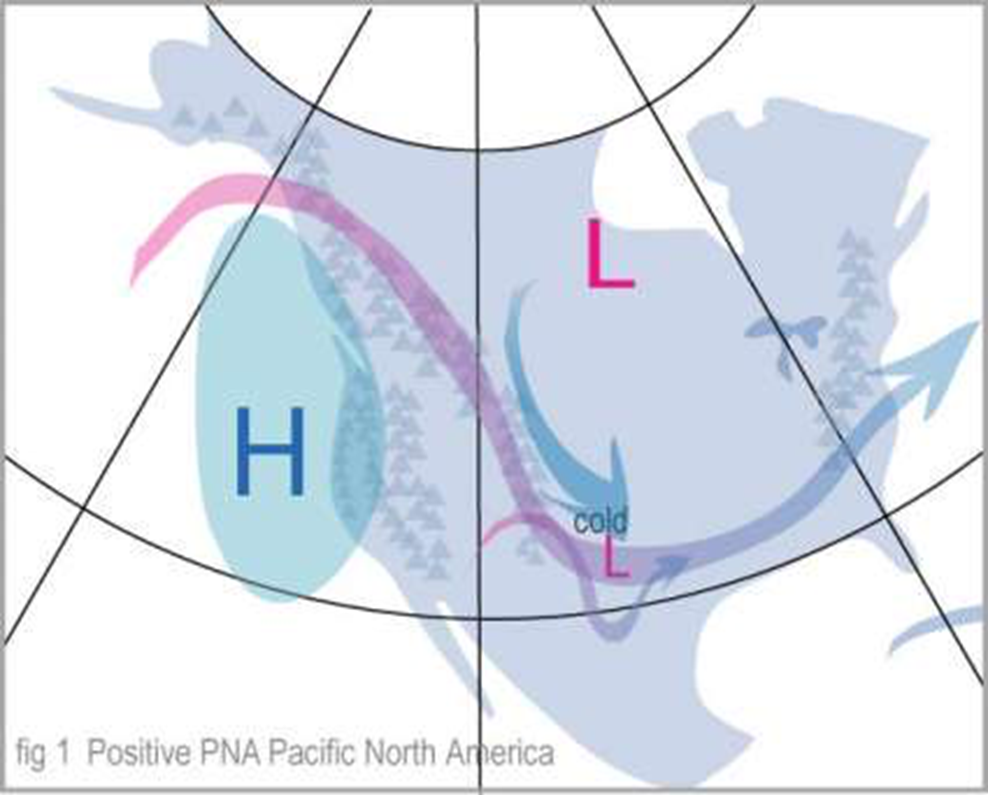 Positive: reflects below normal heights and pressure across high lats of North Atlantic, central North Atlantic, eastern US and western Europe