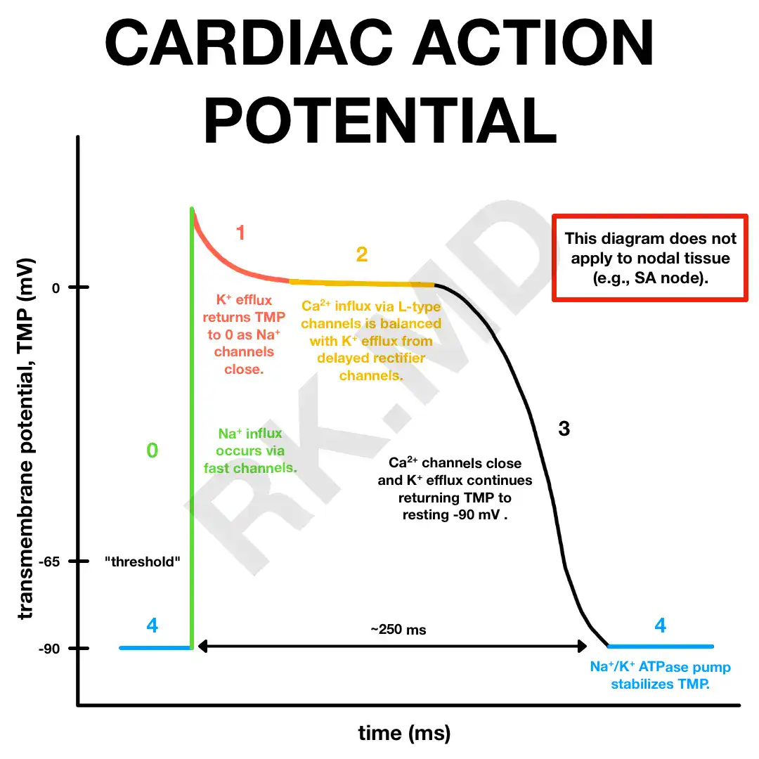 • Phase 4: K⁺ channels open, Ca²⁺ channels close → repolarise to .