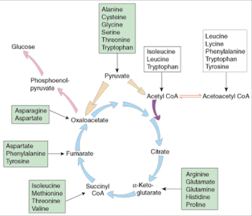 Glucogenic amino acids are catabolised to pyruvate, succinyl CoA, α-ketoglutarate, fumarate or oxaloacetate