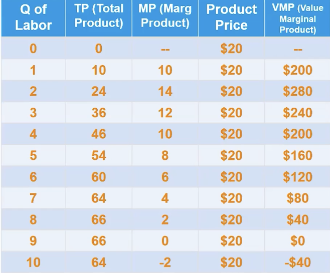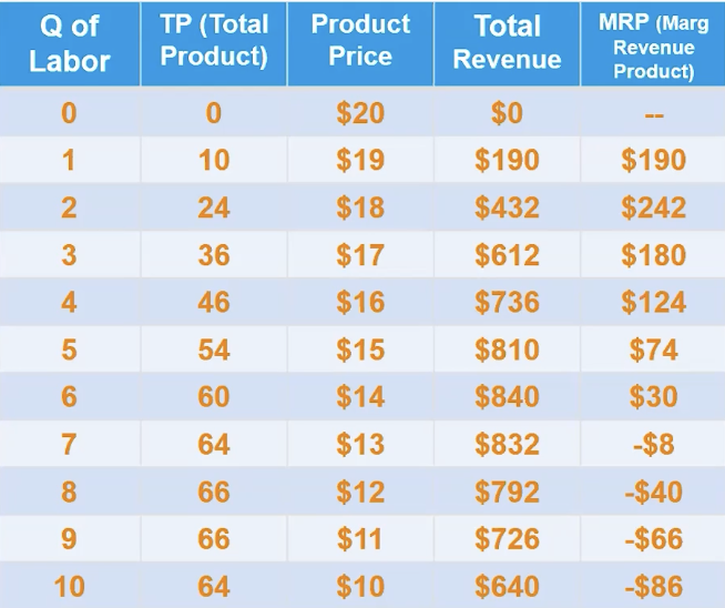 marginal revenue product (MRP): extra revenue that firm gains when firm hires 1 additional worker/resource