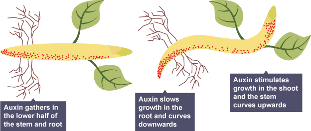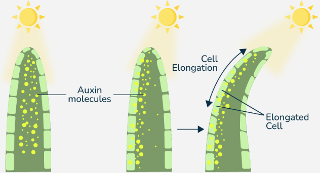 If only one side receives light, the auxin will collect on the shaded side, stimulating the cells on the shaded side to elongate, this difference in growth causes the plant to curve towards the light.