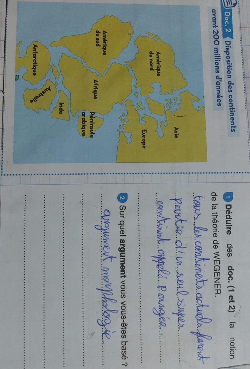 l’Observation du document montre une complémentarité géométrique morphologie entre les côtés africaines et sud-américains De part et d'autre de l'Atlantique ce qui signifie que l'Afrique et l'Amérique du Sud étaient soudée.