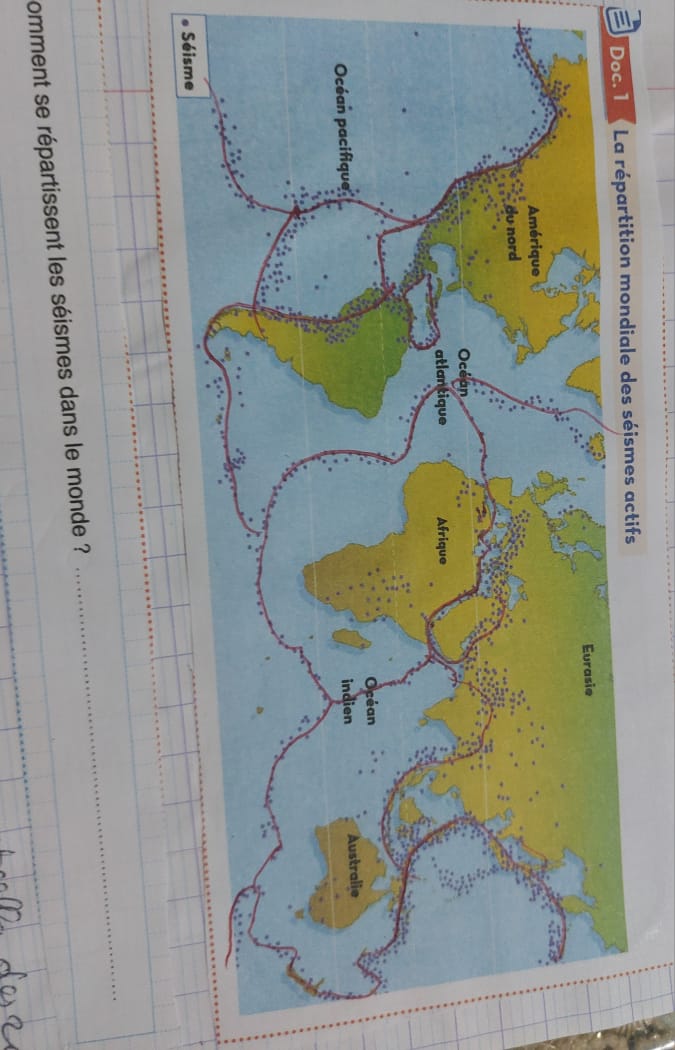 1-Comparez la répartion des séismes et celle des volcans dans le monde