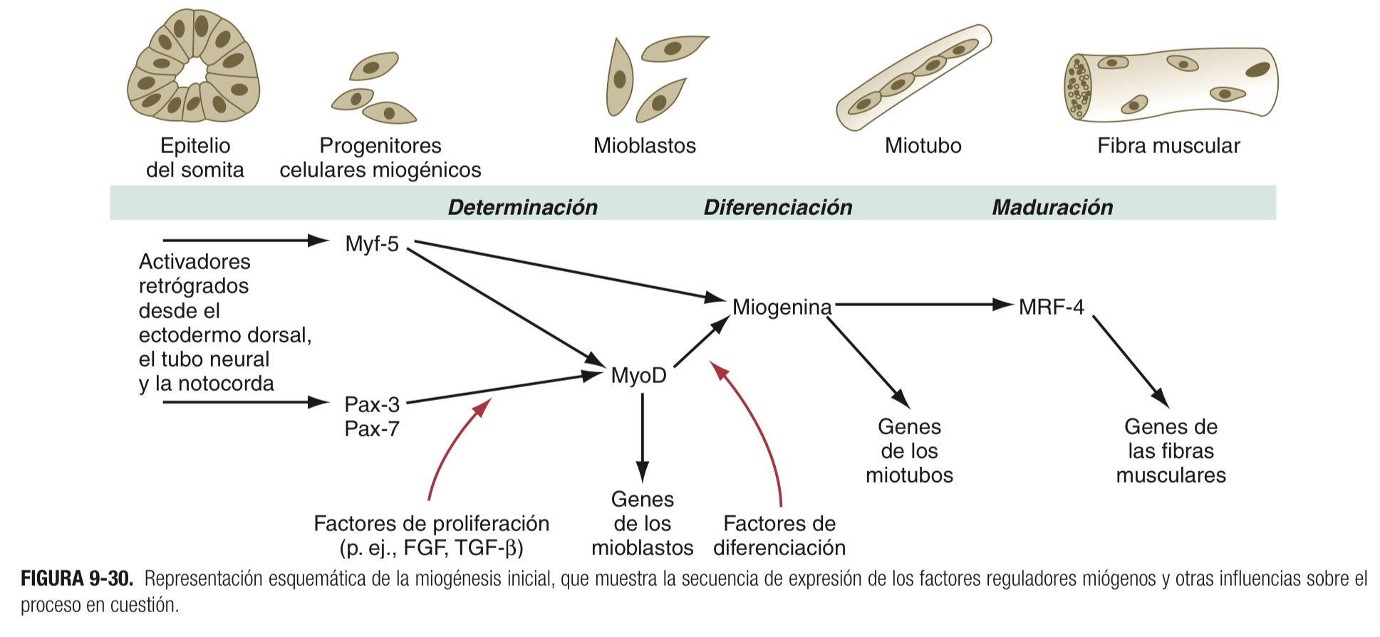La base molecular para este condicionamiento es la acción de distintos miembros pertenecientes a las familias de los factores reguladores miógenos que, actuando como coordinadores de la regulación génica, activan genes específicos del músculo en las células mesenquimatosas premusculares.