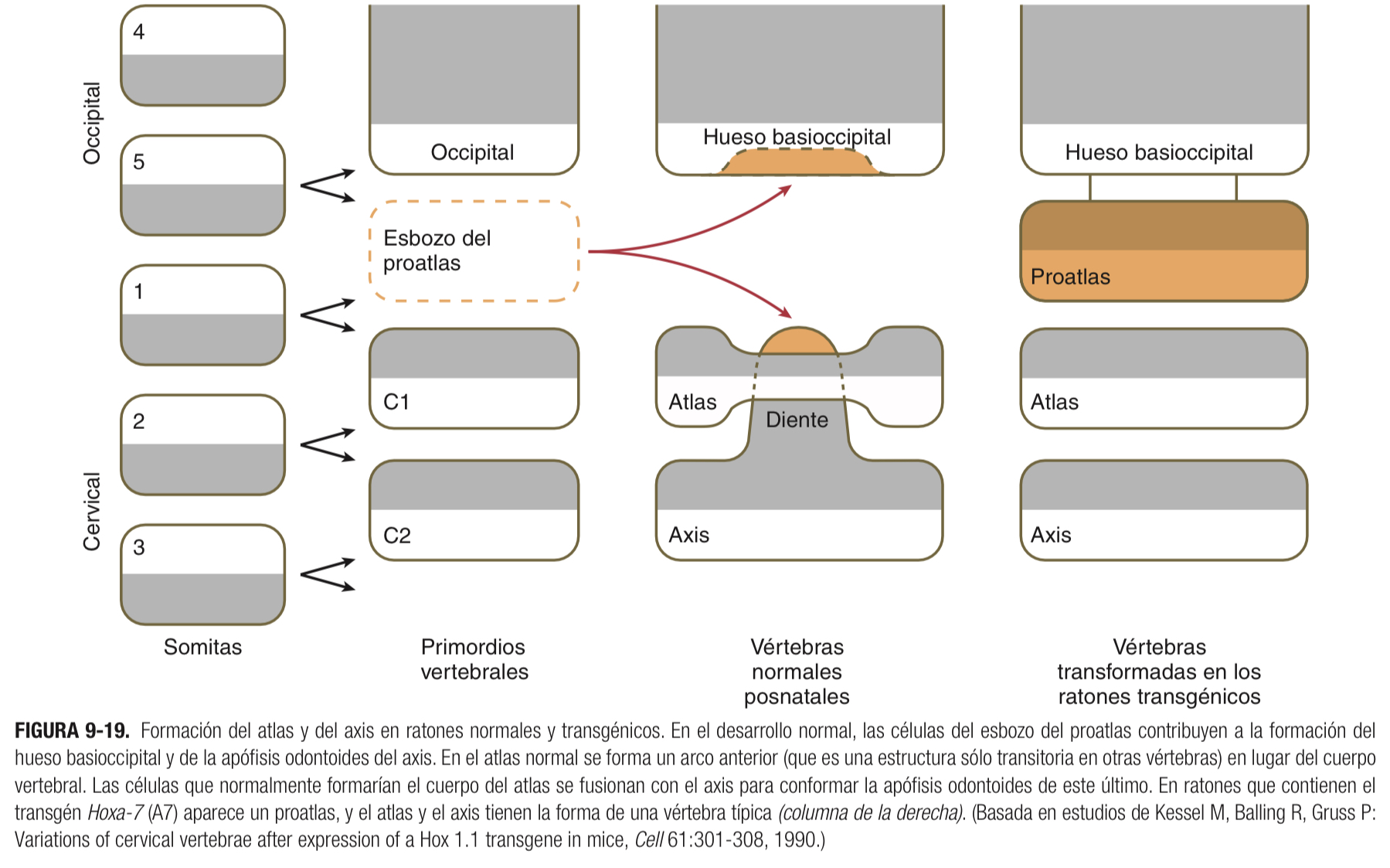 Parte del primer esclerotoma cervical da origen a la parte basal del proceso odontoides (diente), mientras que parte del segundo esclerotoma cervical da origen al cuerpo del axis. La zona lateral del primer esclerotoma cervical se desarrolla hacia el arco posterior del atlas, mientras que la zona lateral del segundo esclerotoma cervical se desarrolla hacia el arco del axis.