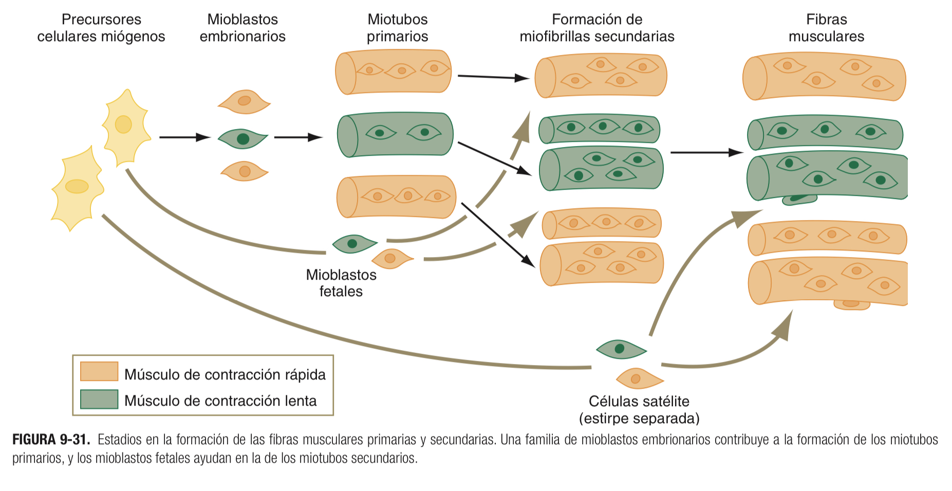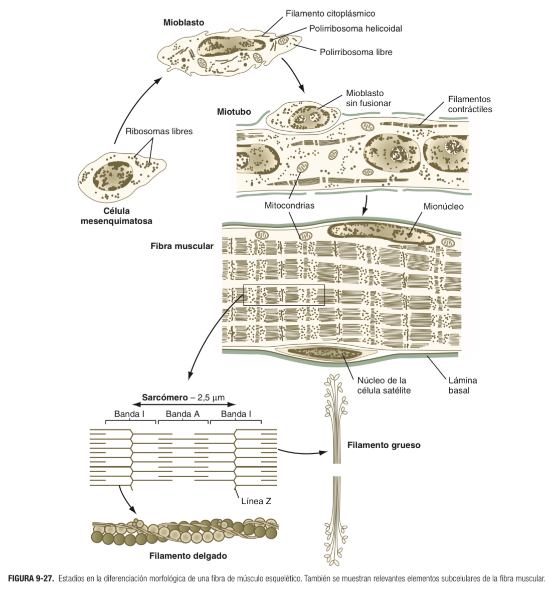 Mayores niveles de MyoD = células mononucleadas se retiran del ciclo mitótico y comienzan a unirse en miotubos. En este estadio se expresa la miogenina. En los miotubos en maduración se expresa MRF-4.