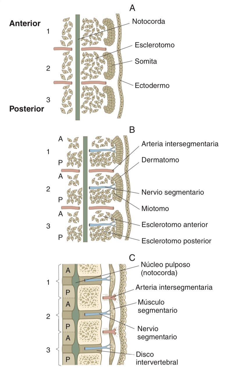 Los esclerotomos segmentarios se dividen y recombinan para formar esbozos vertebrales intersegmentarios. Ocho somitos cervicales forman siete vértebras cervicales. Una vez formado el esbozo mesenquimático, se diferencia el modelo cartilaginoso de las vértebras. La osificación se inicia durante el período fetal , con la aparición de 3 centros primarios de osificación: uno en el cuerpo y dos en los arcos neurales. La osificación empieza en las vértebras cervicales y avanza caudalmente, de modo que a los 5 meses hay centros de osificación en todas las vértebras, excepto las sacras.