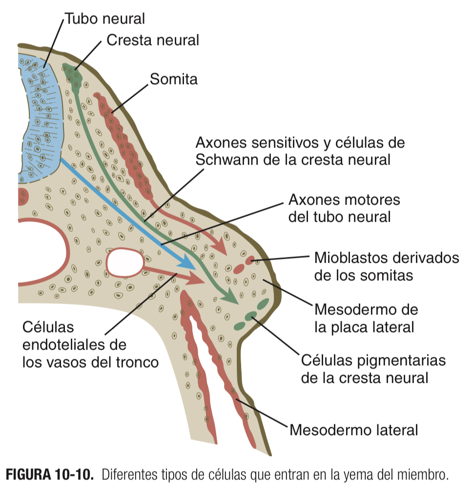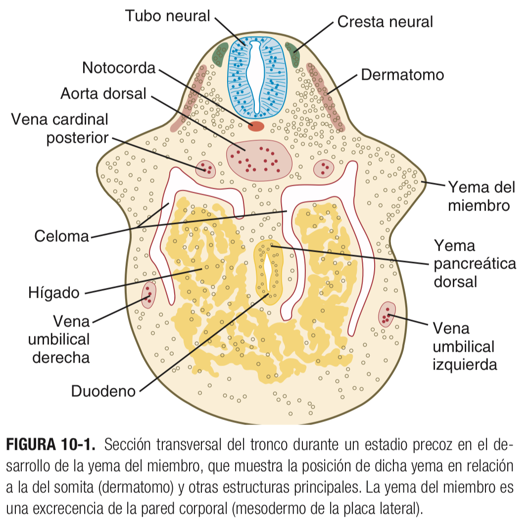 Poco después de su establecimiento, el primordio del miembro comienza a hacer relieve en la pared del tronco. En esta etapa, la yema del miembro es una masa de células mesodérmicas de aspecto similar, cubiertas por una capa de ectodermo.