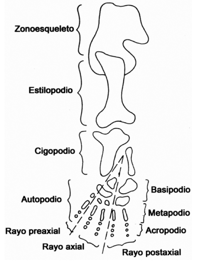 Todos los componentes del esqueleto de las extremidades comienzan como moldes cartilaginosos, que se convierten en auténticos huesos mediante la osificación endocondral durante una fase más tardía en la embriogénesis.