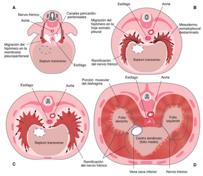 En la imagen superior (A) se observa desde la zona lateral la migración de las células del hipomero hacia la membrana pleuroperitoneal, esta migración va a ser ventralizante, es decir, desde el dorso hacia ventral.