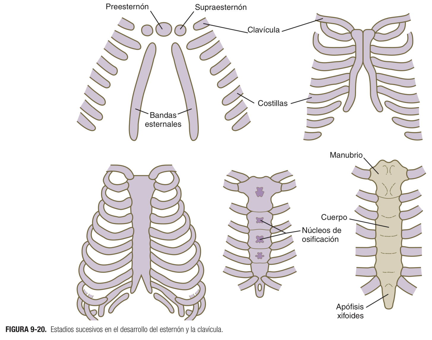 El esternón, que junto con el tejido conjuntivo que rodea la porción distal de las costillas (cartílagos costales) deriva del mesodermo de la placa lateral, se origina como un par de bandas cartilaginosas que convergen en la parte ventral de la línea media al tiempo que se consolida la pared ventral del tronco.